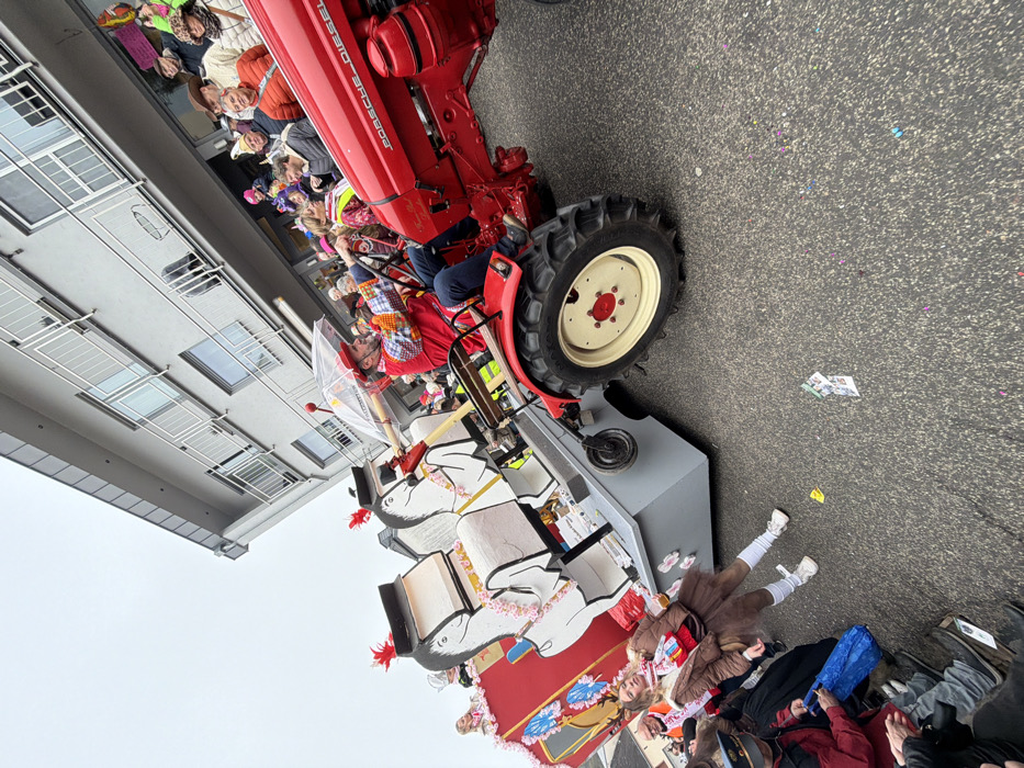 A public street scene in Irsch, Germany, depicts a parade in progress under an overcast sky. A red "Porsche Diesel" tractor is prominently featured, pulling a float. The tractor is driven by a man wearing a red hat, a red vest over a multicolored checkered shirt, and blue jeans, holding a clear umbrella and the steering wheel while looking to his left. The tractor's rear tires are black with cream-colored rims. The float, primarily grey with red decorative accents, features two large, white, stylized horse-like figures holding open books, adorned with small pink flowers and red feathered plumes. Several individuals are visible on the float behind the driver, some in festive attire, including one person in a yellow high-visibility vest. In the immediate foreground, a young woman stands on the asphalt road, leaning slightly backward, wearing a brown jacket, a light-colored ruffled skirt, white knee-high socks, and white sneakers. She has blonde hair and a white and red scarf. Partially visible to her left are other spectators, one of whom is seated. The road surface is scattered with colorful confetti. The background features a multi-story building with a light grey facade, multiple windows, and balconies with metal railings. A crowd of spectators lines the street along this building, observing the parade.