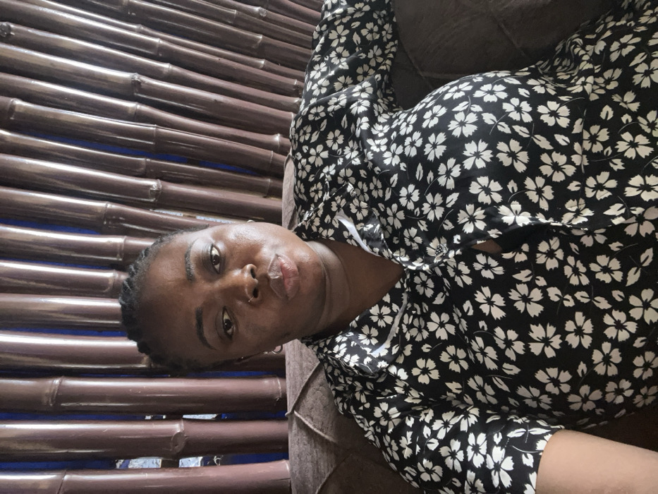 An adult female, depicted from the chest up, is positioned centrally, looking directly at the camera with pursed lips. She has dark skin, braided hair pulled back, and wears a nose ring in her left nostril. She is dressed in a black, collared, button-down shirt or top patterned with numerous small, white, five-petal flowers and green leaves. The top two buttons are unfastened. She is seated on a dark brown, upholstered surface, likely a sofa or chair. The background consists of a wall covered with closely arranged, vertical, reddish-brown cylindrical elements, resembling bamboo or carved wood. Behind these elements, a darker, possibly blue or dark green, surface is partially visible through narrow gaps. The scene is an interior setting. There are no visual cues within the image to specifically identify the location as Abuja, Nigeria.