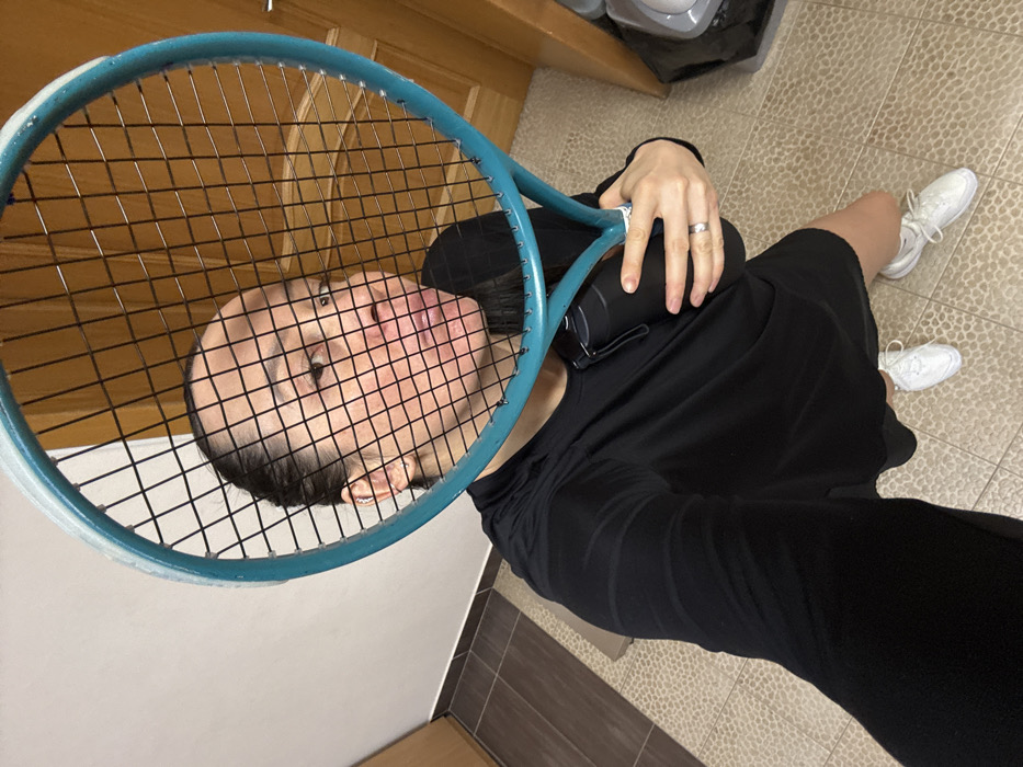 n individual indoors, captured from a high-angle selfie perspective. The person, appearing female, is dressed in a black long-sleeved athletic top or dress and white athletic sneakers. They hold a light-blue framed tennis racket with black strings in front of their face, partially obscuring it. Their right hand also grasps a black cylindrical water bottle, and a silver-toned band ring is visible on the fourth finger of this hand. Dark hair is pulled back, and a small silver earring is present on the left earlobe. The background features a light brown/tan tiled floor with dark grout lines. On the left, a plain white wall transitions to a light-colored wooden door frame and door. Another wooden door frame and a dark, indistinct object are partially visible on the right. The specific location within the city of Chaikovsky, Russia, cannot be determined from the visual evidence presented in the image.