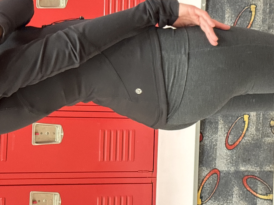 A person wearing black leggings and a black jacket stands beside red lockers and patterned carpet. The person's hand rests on their thigh. The leggings appear to be a dark grey, and the jacket has a subtle emblem on the side. The lockers are a bright red with silver handles. The carpet features a repeating oval pattern in red and yellow against a grey background. The scene appears to be inside a building, possibly a school or gym.