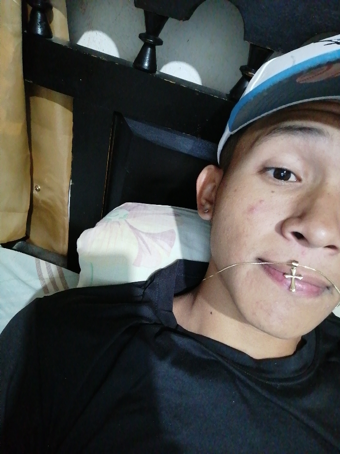 A person wearing a baseball cap and black shirt looks at the camera. They have a gold cross necklace, with the pendant held between their lips. The individual is lying on a bed with a floral patterned pillow behind their head. Part of a headboard is visible in the background, along with curtains or draped fabric on the left side. The lighting is somewhat dim and appears to be indoor.