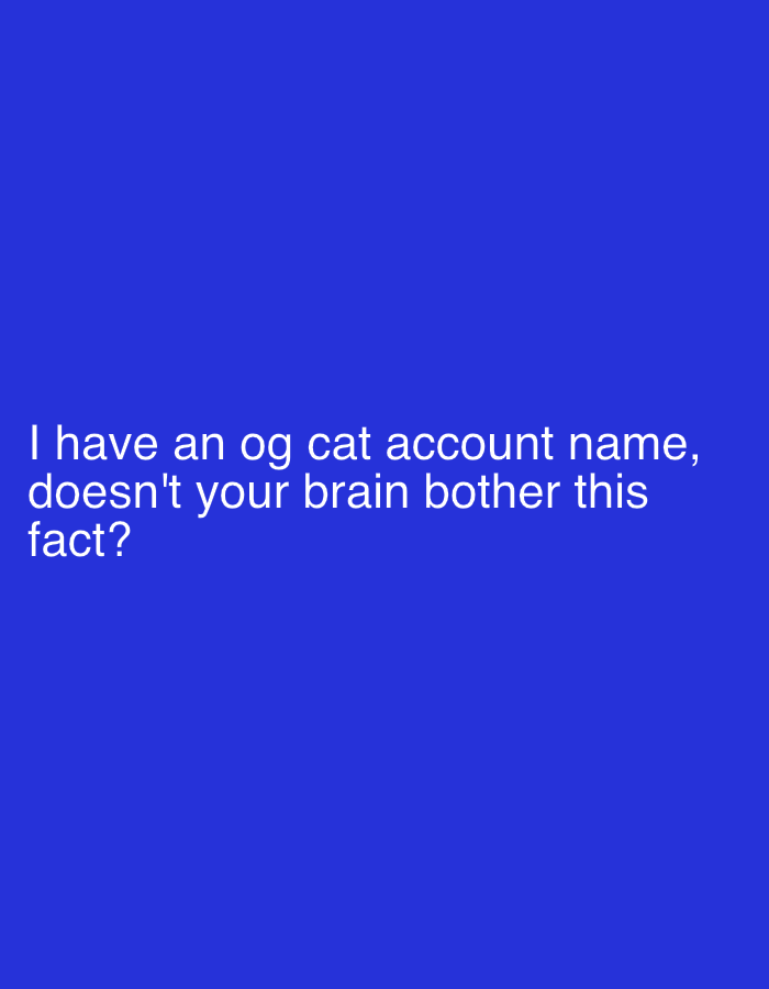 - "The image is a solid blue background with white text stating "I have an og cat account name, doesn't your brain bother this fact?"" by FM-xlahD2, licensed under CC BY 4.0
