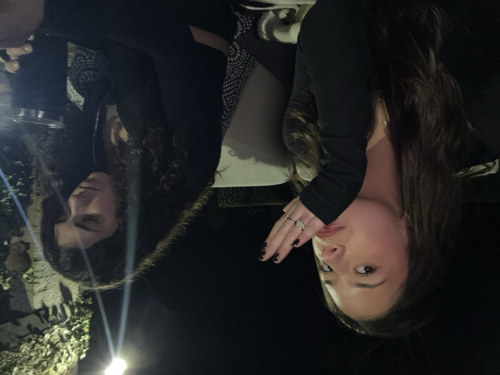 The image depicts two females seated outdoors at night in Huasca de Ocampo, Mexico. The scene is illuminated by an overhead artificial light source visible in the upper right. The female on the left has long, dark brown hair and is wearing a black long-sleeved top. She is positioned facing slightly right, looking directly at the camera with a slight pout. Her left hand is raised near her mouth, forming a kissing gesture; dark nail polish and two rings are visible on her fingers. The female on the right has long, dark, curly hair and is also wearing a black long-sleeved top. She is seated facing forward but her head is tilted downwards and to the right, looking away from the camera. She holds a dark, cylindrical insulated cup or tumbler in her right hand. Both are seated on a light-colored outdoor sofa or cushioned bench, with a patterned throw blanket or pillow visible between them. In the background, behind the female on the right, a stone or stucco wall partially covered with ivy and a structural column are visible. The remainder of the background is dark, indicating nighttime.