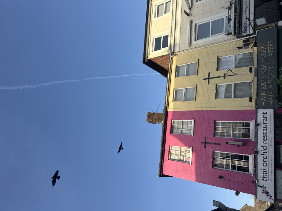 The image depicts an upward view of three adjacent building facades on Milford Street in Salisbury, United Kingdom, under a clear blue sky. The central building features a two-story facade divided vertically: the left half is painted bright magenta, and the right half is light yellow. Both sections contain two vertically elongated rectangular windows with white frames and visible white curtains or blinds. Between the upper and lower windows on both the magenta and yellow sections, a dark, cross-shaped decorative element is affixed. A brick chimney stack is visible at the roofline, positioned above the color division. At street level, the magenta section houses the "Thai Orchid Restaurant," with a sign displaying "fully air-conditioned licensed restaurant" and the phone number "01722 414 778." The yellow section accommodates "HAIR EXTENSIONS AT HAIR & BODY SHAPERS" under a dark canopy. To the immediate right, a cream-colored building facade with white-framed windows is partially visible, featuring a black projecting sign for "landon marketing and..." The leftmost edge shows a portion of another light-colored building. The clear blue sky above features two dark bird silhouettes in flight: one larger bird is positioned in the upper left, and a smaller bird is lower and more centrally located. A faint, vertical aircraft contrail extends from the top of the frame downwards, slightly to the right of the center. The scene is brightly illuminated by direct sunlight, casting even light across the building fronts. No individuals are present.