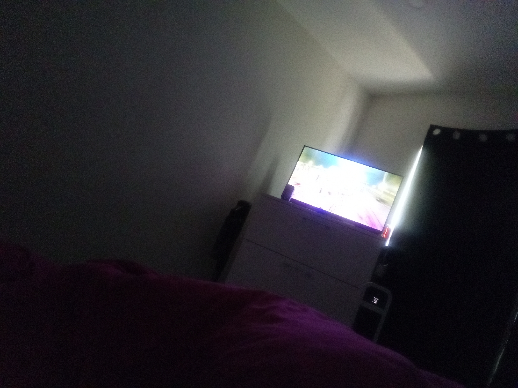 The image depicts an indoor room, likely a bedroom, viewed from a low angle, suggestive of being taken from a bed. The room is dimly lit, with the primary light source emanating from a bright television screen positioned on a light-colored dresser or cabinet. The screen displays vibrant, colorful content, illuminating the immediate surroundings. To the right of the television, a vertical light fixture or panel casts a bright glow. Below this light, a digital display shows the number "78." A dark, grommet-top curtain is drawn on the far right, obscuring a window. In the foreground, a dark magenta or deep purple fabric, appearing to be bedding, occupies the lower left portion of the frame. No individuals are visible. The walls and ceiling are light-colored, illuminated unevenly by the artificial light sources. The specific location within the city of Los Angeles, United States of America, cannot be determined from the visual evidence presented in the image.