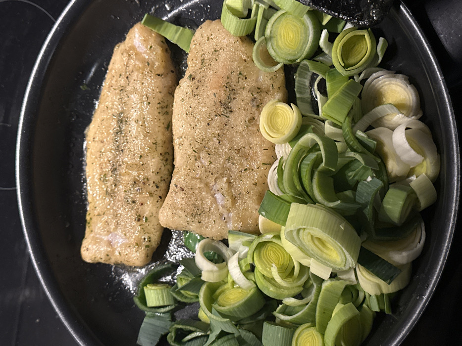 A close-up, overhead view captures two seasoned fish fillets and a substantial quantity of sliced leeks cooking in a black frying pan