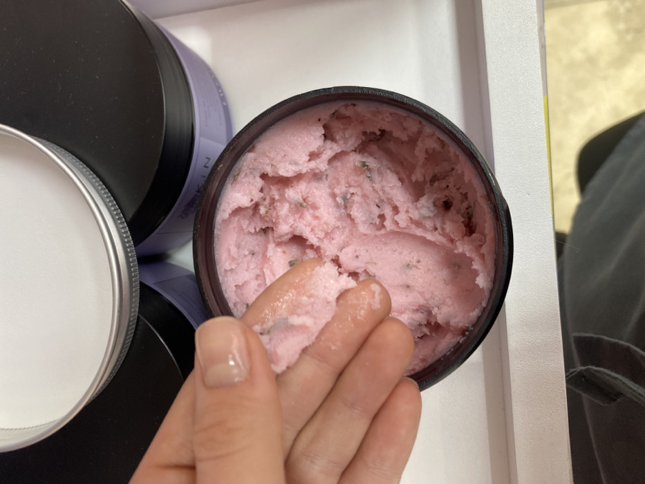 - "A close-up, top-down view depicts a human left hand partially immersed in an open dark-colored jar containing a light pink, granular substance, likely a cosmetic scrub, visible in Saratov, Russia" by FM-Aryqt1, licensed under CC BY 4.0