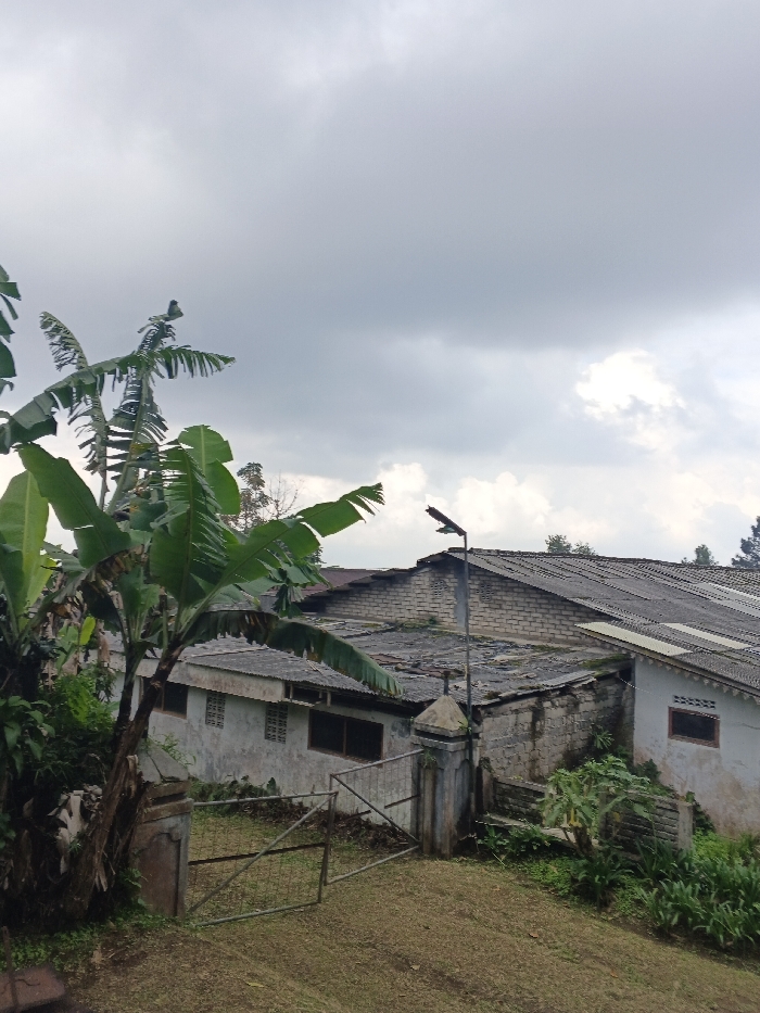 This image displays an exterior scene in Lokossa, Benin, under a predominantly cloudy, overcast sky. In the left foreground, several banana plants with large green leaves are visible. A metal gate, appearing partially open, is centrally located in the midground, flanked by two concrete or stucco gateposts. The ground immediately inside the gate is covered in sparse, yellowish-green grass. Behind the gate and extending to the right are multiple single-story buildings. The building closest on the left features light-colored walls with several rectangular windows, some fitted with horizontal grates. Further back, buildings exhibit exposed concrete block walls and dark, weathered corrugated metal roofs. A pole-mounted fixture, identified as a solar-powered LED light, stands near the right gatepost. No individuals or animals are present.