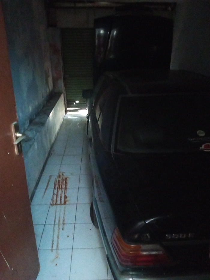 A dark garage features a black car with its hood open, parked close to the right wall. Behind the car, a partially raised metal door provides a glimpse of light. The garage's left wall, painted in a blue-gray tone, has a concrete ledge running along its base. The tiled floor shows dark stains. A brown door is partially visible on the left edge of the frame, adding to the overall confined and shadowy atmosphere.