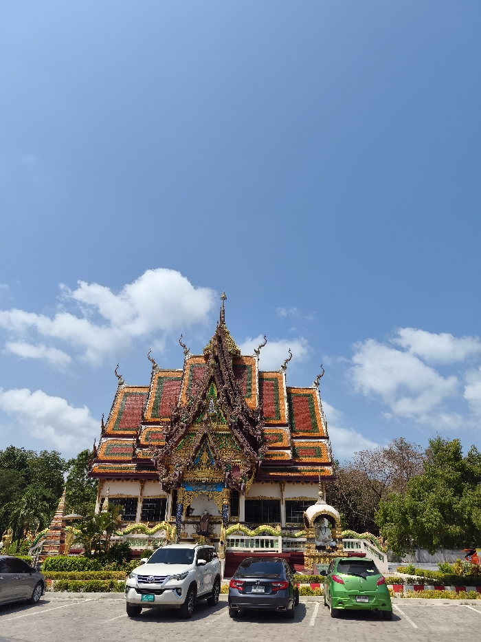 A temple with a multi-tiered, elaborately decorated roof stands against a partly cloudy blue sky. Its roof features red, orange, and gold patterns. Below, a parking lot shows four cars: a light-colored SUV, a gray sedan, a green hatchback, and a silver car. Greenery surrounds the temple and parking area.