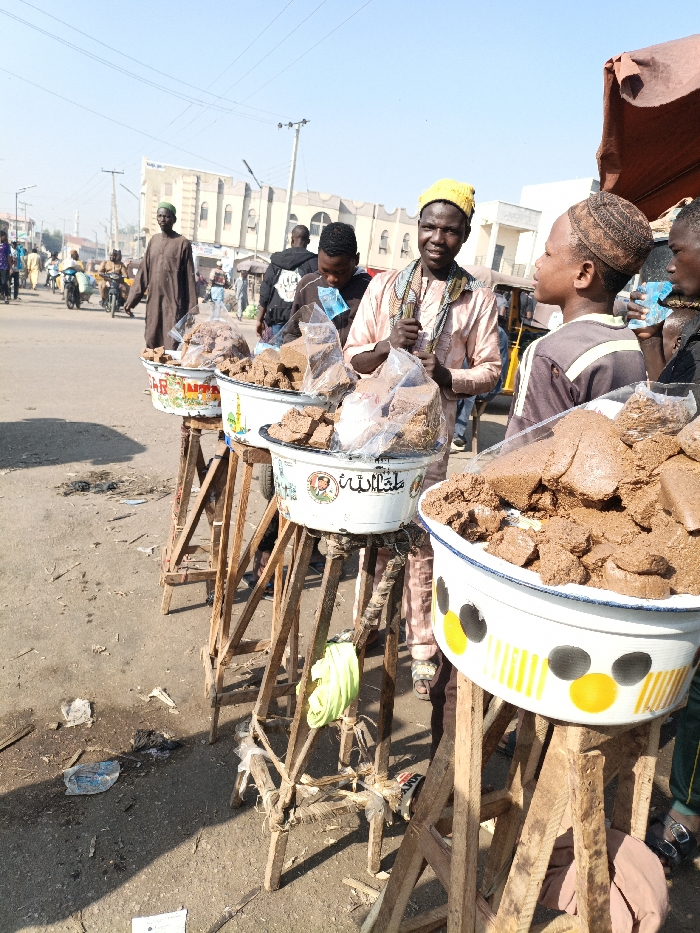 The image captures a bustling outdoor market scene in Kofar Mazugal, Nigeria, under clear daylight. In the foreground, four white enamel basins, elevated on crude wooden tripod stands constructed from rough timber, are filled with a dark brown, lumpy solid substance. Portions of this substance are contained within clear plastic bags. The ground beneath the stands is an unpaved, dusty surface scattered with plastic bags and other litter. A central male figure, identifiable as a vendor, stands behind two of the basins. He wears a light-colored, long-sleeved shirt, a patterned scarf, and a bright yellow knitted cap, and is smiling towards the viewer while holding a bundle of banknotes in his left hand. To his right, a young boy in a striped long-sleeved shirt and a brown skullcap holds a clear plastic sachet, looking leftwards. Another boy is partially visible behind him, also holding a plastic sachet. To the vendor's left, a younger male in a dark hoodie is seen looking down at the products in a basin. In the midground and background, the scene reveals a street with pedestrian traffic, including a man in a long brown gown walking left. Motorbikes are present further down the road. Buildings with light-colored facades, some featuring arched windows, line the street. Utility poles with overhead wires are visible against a clear blue sky. Shadows are distinct, indicating strong sunlight.