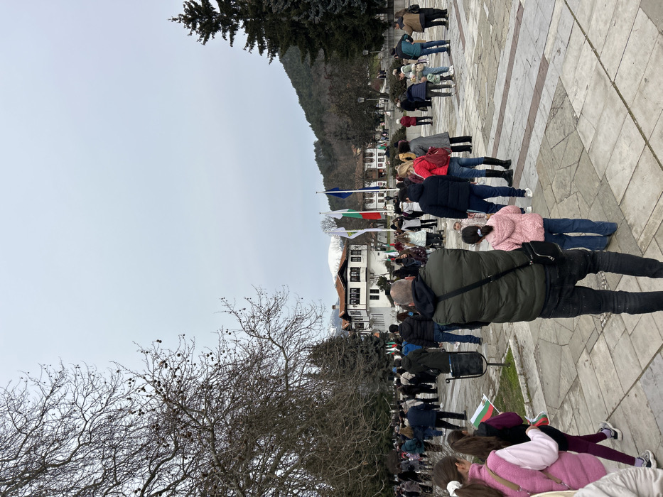 An outdoor gathering is depicted in a paved public square in Kalofer, Bulgaria, under an overcast sky