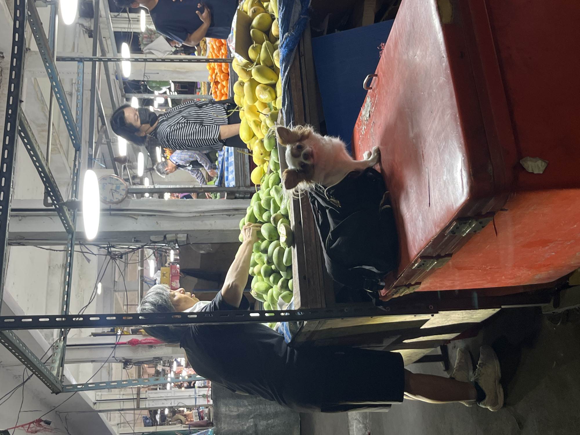 An indoor market stall is depicted within the Samrong Nuea Subdistrict Municipality, Thailand, illuminated by overhead fluorescent lighting. In the foreground, a small, long-haired, brown and white Chihuahua-type dog, wearing a black harness or garment, sits upright on a scuffed red cooler, facing towards the viewer with its tongue slightly protruding. To the immediate left, a person with short grey hair, wearing a black t-shirt and shorts, with a white mask pulled down under their chin, reaches into a large mound of green, unripe mangoes situated on a wooden market stall. A segment of a halved green mango is visible among the pile. Behind this, another pile of ripe, yellow mangoes is present on a blue tarp covering the stall. Further back, a female individual with dark hair, wearing a black and white striped shirt and a black face mask, stands observing the fruit. In the deeper background, additional market activity, produce, and indistinct figures are visible under further artificial lighting. Exposed electrical wiring and metal shelving frames are present throughout the overhead structure.