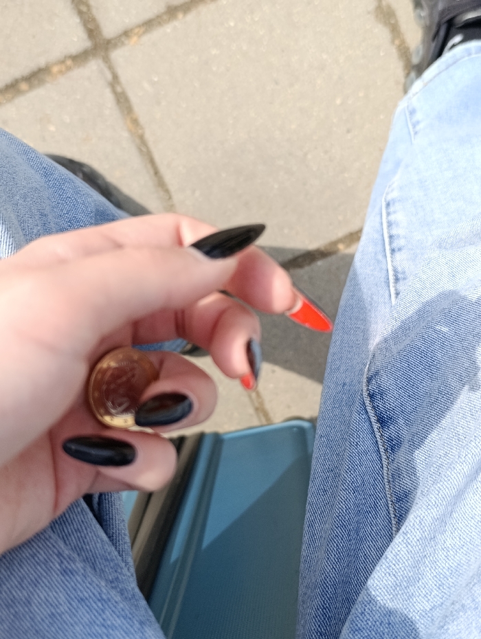 A close-up, top-down perspective captures a person's upper legs and hands. The subject wears light blue denim jeans. The left hand, with light skin tone, prominently displays long, almond-shaped fingernails. Most nails are painted opaque black; however, the nail on the ring finger features a distinct red section. This hand is holding a circular, gold-toned coin between the thumb and index finger. The visible side of the coin shows a design consistent with a 1 Euro coin, depicting a stylized map of Europe and stars. Between the subject's legs, a light blue object with a textured surface, possibly a seat or container, is partially visible. The right foot, positioned in the upper right quadrant of the image, is fitted with a black object resembling a rollerblade or inline skate. The ground surface consists of light gray rectangular pavers arranged in a grid pattern with visible grout lines. The scene is brightly illuminated by natural sunlight, casting sharp shadows on the jeans and the blue object. The specific location within Plovdiv, Bulgaria, cannot be determined from the visual information provided.