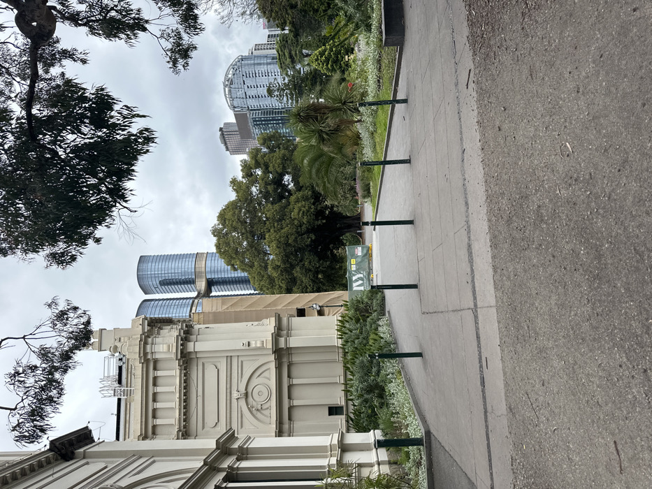 A sideways view captures a park scene with buildings in the background. A historic building with ornate architectural details stands to the left, contrasted by modern, cylindrical skyscrapers. Green trees partially obscure the structures. A sidewalk with green posts runs along the right side of the frame, adding a sense of depth. The sky is overcast, creating a muted atmosphere.