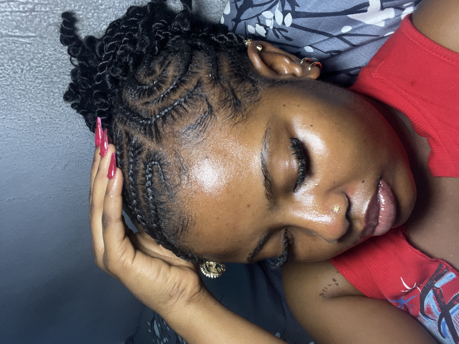 An individual is depicted indoors in Asipa, Nigeria. The subject, a person with dark skin, is shown from the upper chest upwards, with eyes closed and lips slightly parted and glossy. Their hair is styled with intricate cornrows forming patterns on the scalp, transitioning into dark, curly twists at the top. A left hand, featuring long, pointed pink nails, rests on the top of the head near the hairline. The subject wears a small gold-colored nose stud in the right nostril. The visible left ear has a gold-colored helix piercing and two gold-colored hoop earrings in the lobe. A red sleeveless garment is visible on the lower portion of the frame. The background consists of a dark, textured wall and a grey patterned fabric, possibly bedding. The lighting highlights the sheen on the subject's forehead and cheeks.