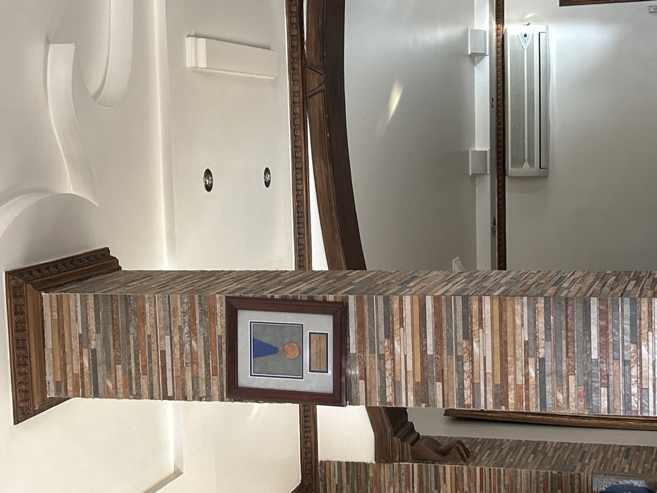 This image depicts an interior architectural detail within a building located in Sarouja Municipality, Syria. A prominent vertical column, clad in multi-toned rectangular stone or tile strips (brown, gray, beige, orange), stands centrally. The column features a dark brown, carved wooden capital. Mounted on the column is a framed award containing a circular bronze-colored medal suspended by a blue ribbon, with text partially visible below, indicating "Al-Sharif" and "2008". The white ceiling above exhibits decorative plasterwork, including curves and two recessed circular spotlights. A dark brown, carved wooden archway or beam is visible in the upper right. Below the archway, a white wall holds a white wall-mounted split-system air conditioning unit and white decorative moldings. No individuals are present.