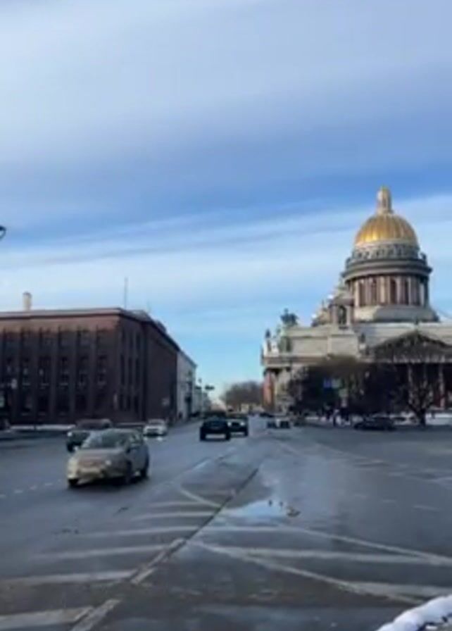 street scene with traffic in front of Saint Isaac's Cathedral in St. Petersburg, Russia. The sky is mostly blue with some wispy clouds. The cathedral is a large, neoclassical building with a gold dome. To the left of the street is a brick building. Cars are driving on the wet road. There is some snow on the curb.