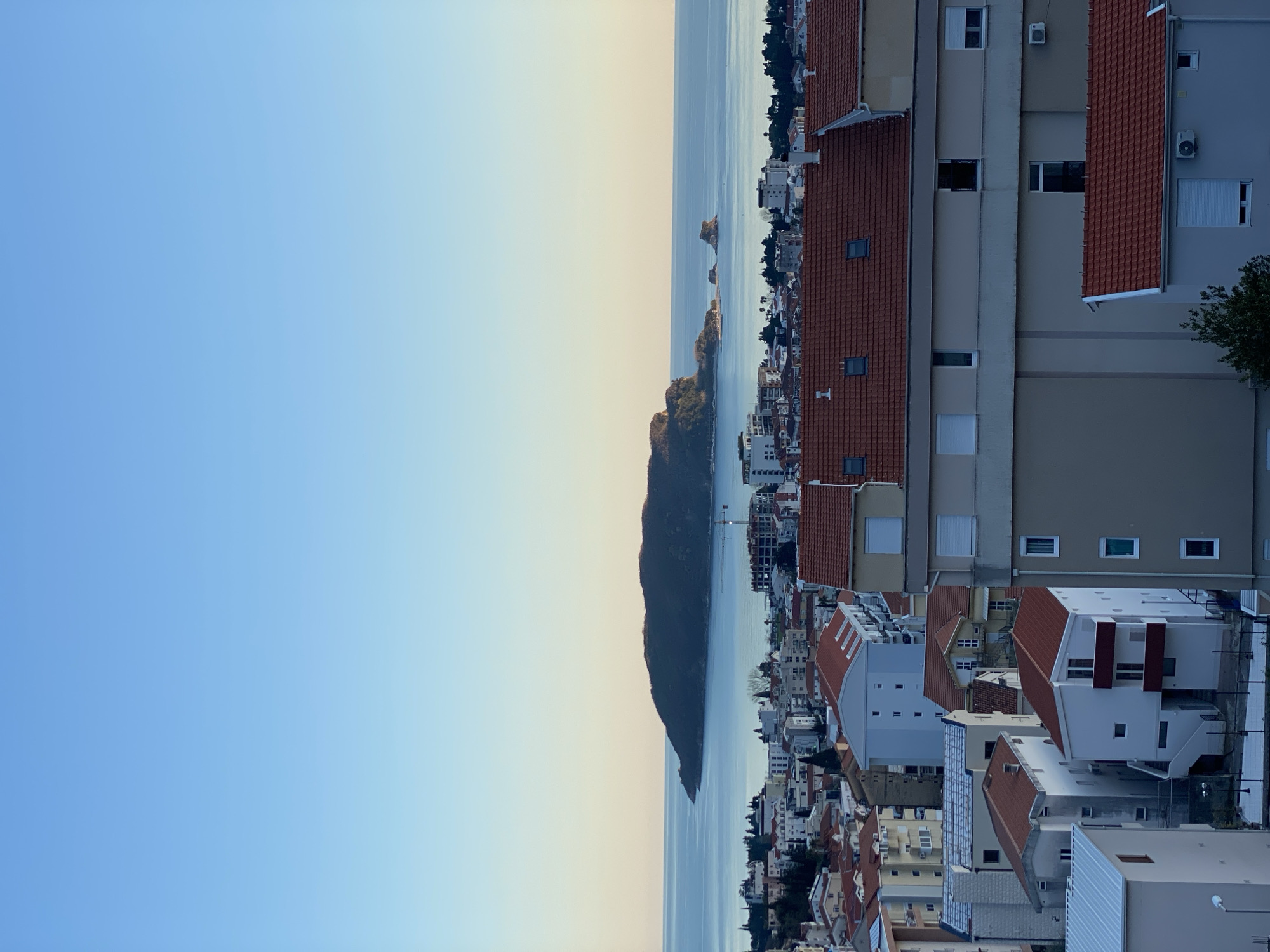 n elevated view of Budva, Montenegro, facing the Adriatic Sea. The left side of the image primarily displays a clear sky transitioning from blue to light yellow. The sea occupies the central portion, reflecting the sky's colors. Sveti Stefan island and other smaller rocky formations are visible in the distance. The right side of the image features a dense urban landscape with buildings of varying heights and architectural styles. Red-tiled roofs dominate the scene. The buildings appear to be residential and commercial structures. The image captures a coastal cityscape during daylight hours with calm sea conditions.