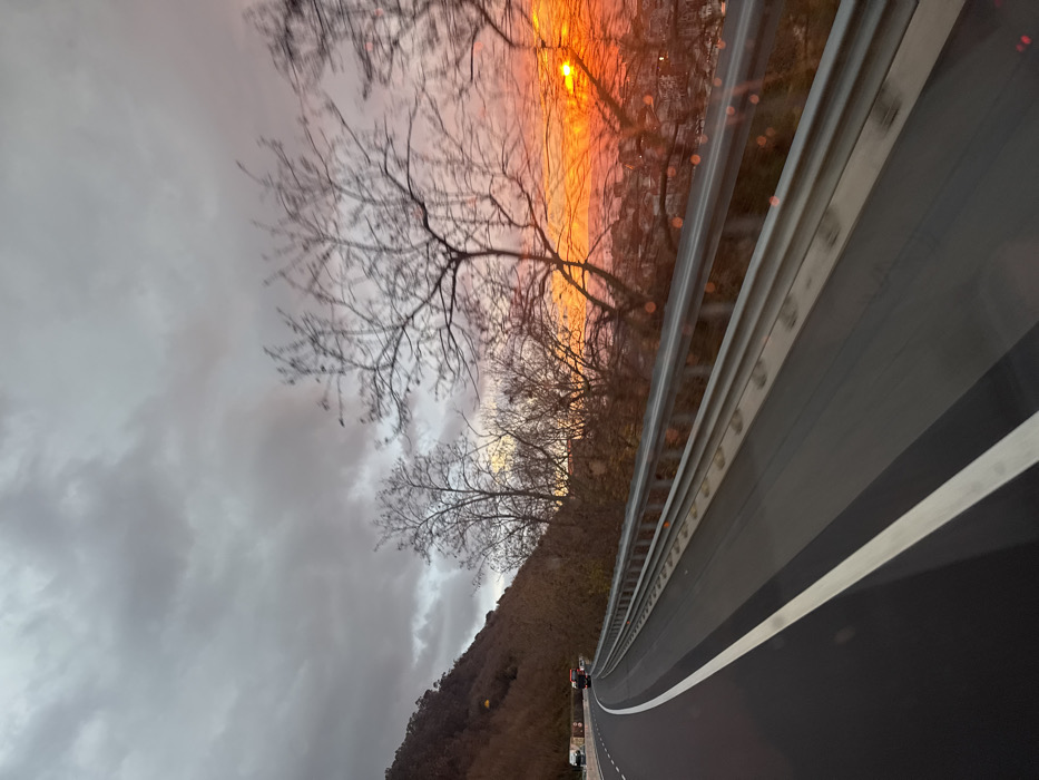The image depicts a multi-lane asphalt highway, likely the A2 Autostrada del Mediterraneo, overlooking the city of Pizzo, Italy, at either sunrise or sunset. The perspective is from a moving vehicle on the highway, with the road curving to the left in the distance. In the foreground, a dark asphalt road surface occupies the lower left quadrant, featuring a solid white lane marking on its left edge. A metal guardrail system, composed of multiple horizontal rails, runs along the right edge of the road, separating it from the downward slope. To the left of the road, a steep, densely vegetated hillside rises, covered primarily with bare deciduous trees and some evergreen foliage. Several trucks are visible on the distant curve of the highway. To the right of the guardrail, numerous bare deciduous trees obscure a panoramic view of the city of Pizzo below. The sky in this area is dominated by a vibrant orange and red glow, indicative of a low sun on the horizon, casting light over the urban landscape. The upper portion of the sky is overcast with heavy grey clouds, transitioning to lighter grey and pink hues as it approaches the horizon. No individuals are discernible in the scene.