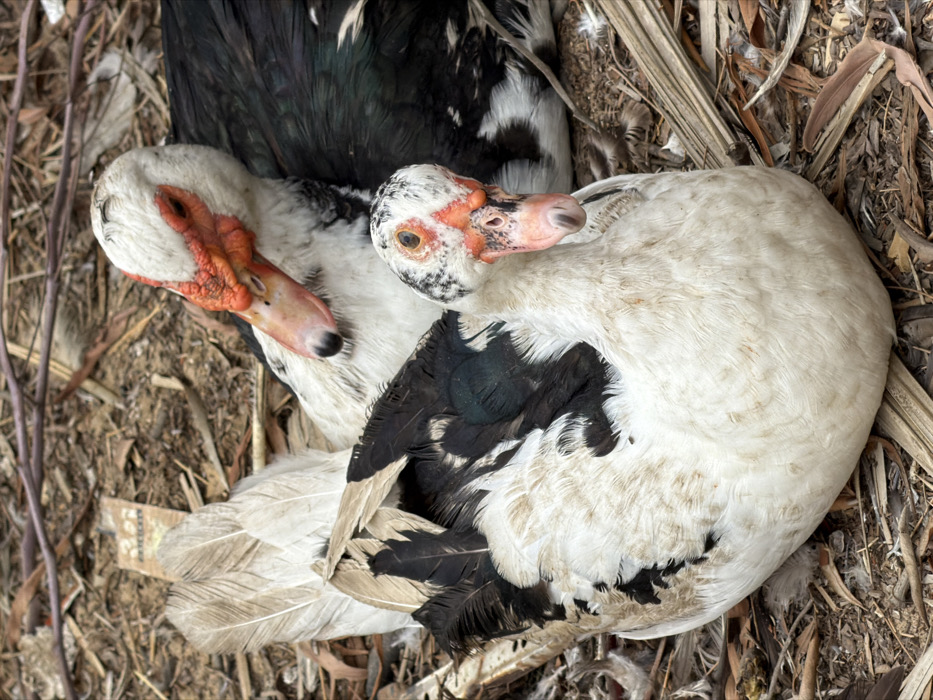 - "Two Muscovy ducks are depicted resting on a ground surface composed of dry organic matter, including soil, dead leaves, small branches, and scattered feathers" by FM-PSI0J3, licensed under CC BY 4.0