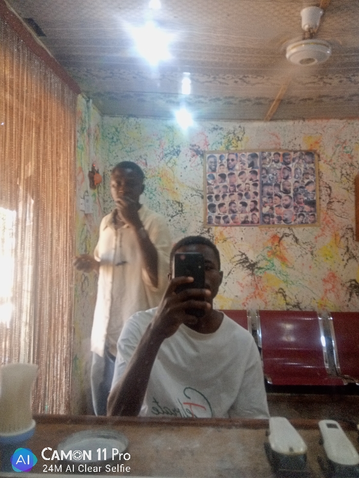 This image depicts the interior of a barbershop located in Unguwan Rimi, Nigeria, captured as a mirror selfie