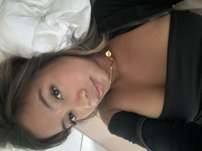 A woman is seen lying on her back, partially on a white pillow or sheet. She is wearing a black top or dress with long sleeves, featuring a zipper detail on the shoulder. Her hair is light brown and partially covers her left side of the face. She is wearing a gold necklace and dangling earring. The background is blurred but appears to be a floor or wall. The image is taken from a high angle.