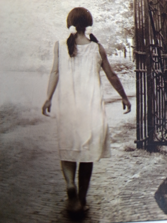 The image is a black and white photograph capturing a solitary female individual from behind, walking away from the viewer on a paved path composed of rectangular stones. She wears a light-colored, sleeveless dress that extends to just above her knees. Her dark hair is styled, possibly in two ponytails, secured with light-colored ties or bows, and a dark-feathered bird is perched on her right shoulder. To the right of the frame, a dark, metal gate or fence with vertical bars is visible. The background to the left of the individual is a blurred, bright expanse, indicative of an open natural environment or water, while the area beyond the gate to the right shows dense foliage. The scene is located in Kamenz - Kamjenc, Germany.