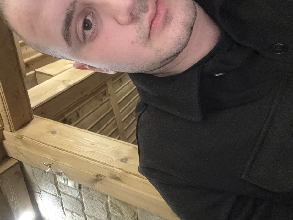 An angled, close-up photograph depicts a light-skinned male individual, visible from the chest up, in an indoor setting within the city of Samokov, Bulgaria. The individual has a shaved head and visible stubble on his jawline and chin. He is wearing a dark, collared jacket over a dark undershirt, with two dark buttons visible on the jacket's front. His right eye, a portion of his nose, and his mouth are discernible, with his gaze directed forward. The background consists of a wall constructed from light-colored, rough-hewn stone blocks on the left side of the frame, with a small white electrical fixture and a metallic hook attached to a prominent light-colored wooden beam positioned in front of the stone. To the right and overhead, a structural framework of intersecting light-toned wooden beams forms a ceiling or roof. An artificial light source is visible in the upper left quadrant. No actions or interactions are depicted.
