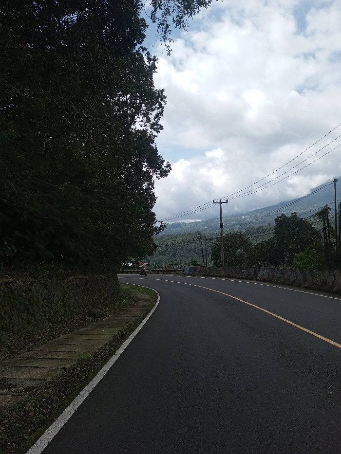 The image displays a two-lane asphalt road curving to the right in Gubbisamamidi, India. The road surface is dark, with a solid white line defining the left edge and a solid yellow line indicating the center. To the left of the road, a stone retaining wall, partially covered with moss, supports a dense embankment of dark green foliage. A narrow concrete pedestrian path runs between the retaining wall and the road. In the middle distance, on the right side of the road, a single small, reddish-orange motorized scooter is visible, appearing to move away from the viewer. Several utility poles carrying multiple power lines are present along the right side of the road and extend into the background. Beyond the road, a concrete barrier transitions into a distant landscape of heavily forested hills and a valley, partially obscured by atmospheric haze or clouds under a largely overcast sky.