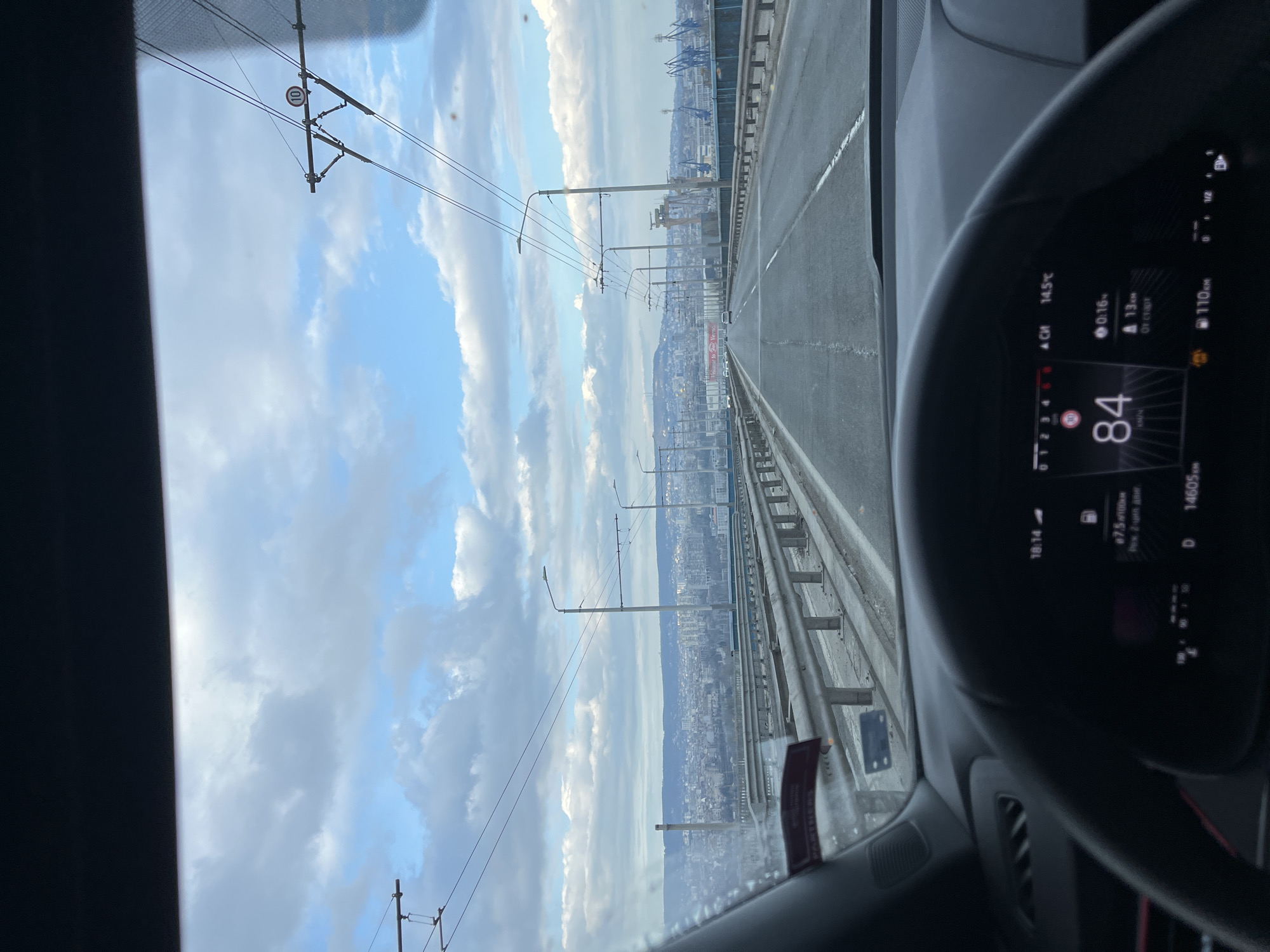 The image depicts a view from inside a car, seemingly driving across the Asparuhov Bridge in Varna, Bulgaria. The dashboard is visible, indicating a speed of 84 km/h. The city of Varna is visible in the background, featuring the cityscape and port infrastructure, including cranes. Overhead electrical lines and streetlights are present along the bridge. The sky is partly cloudy, with patches of blue. The car's digital display shows various information such as fuel consumption, temperature, and distance traveled.