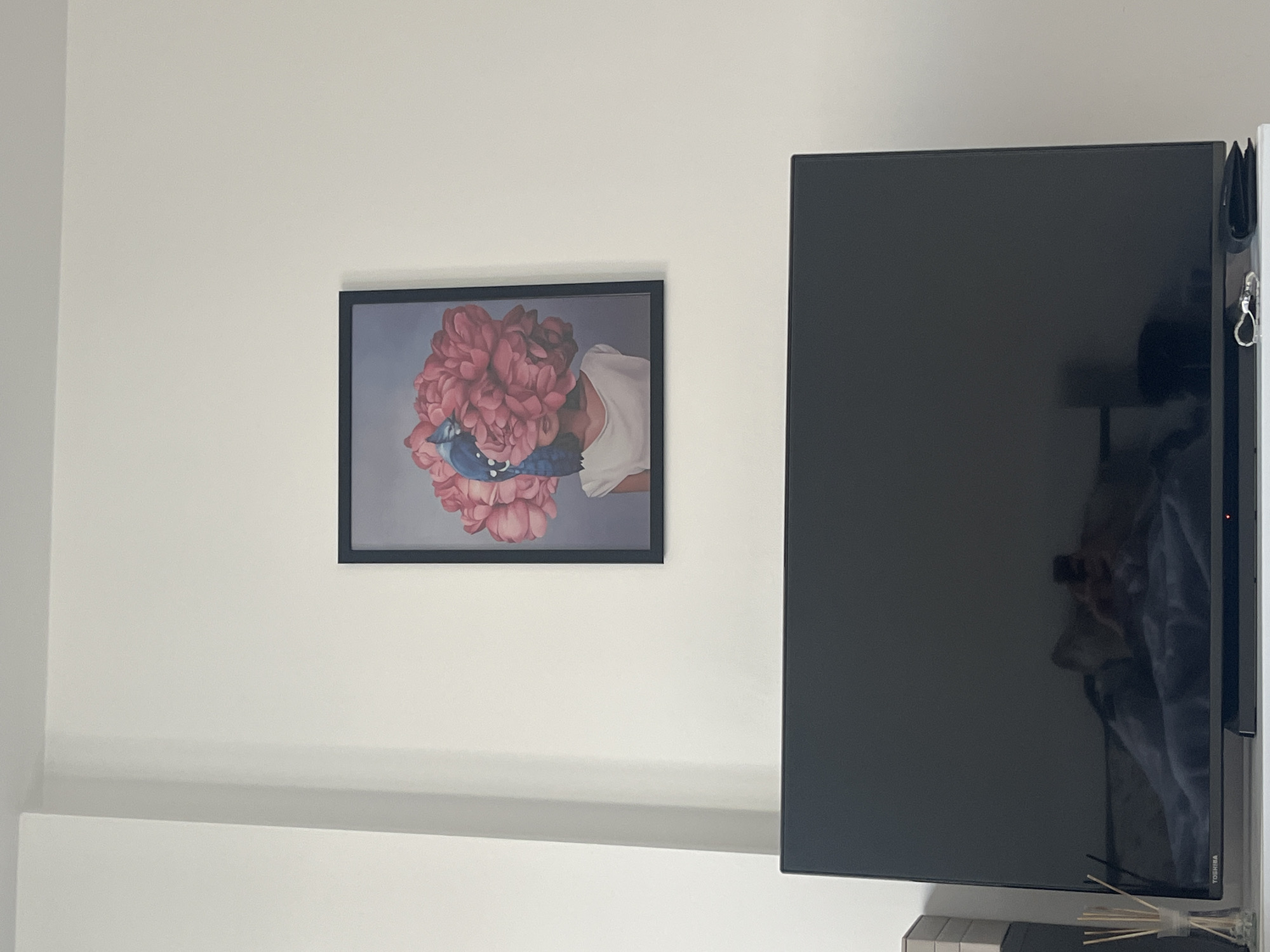 The image displays an interior room with plain white walls and a white ceiling visible at the top. On the upper half of the primary wall, a rectangular framed artwork is centered. The artwork depicts the upper torso of a figure, possibly female, wearing a white top. The figure's head is replaced by a dense cluster of pink, multi-petal flowers, from which a blue bird, possibly a peacock, emerges, facing left. Below the artwork, a large, black, flat-screen Toshiba television rests on a white stand. The TV screen is off and reflective, showing a blurred reflection of a person holding a smartphone, and a bed with light-colored bedding. On the white stand, to the left of the television, a clear glass diffuser bottle with multiple reeds is visible, alongside a stack of light-grey rectangular boxes. To the right of the television, on the stand, are a small metallic keychain and a dark-colored wallet or pouch. A vertical wall corner is present on the far left. There are no discernible features in the image to indicate its specific location within Sofia, Bulgaria, or any city.