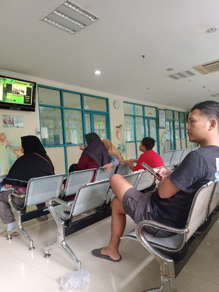 The image depicts an indoor waiting area in a clinic or hospital located in Margorejo, Indonesia