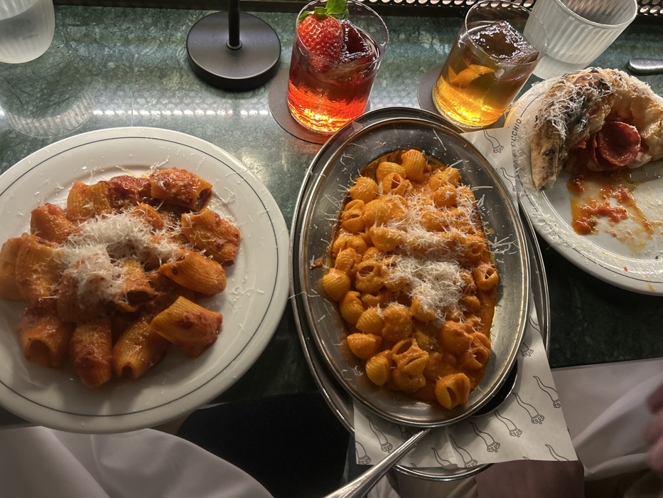 An overhead shot reveals a table laden with food and drinks. Two plates of pasta, one with rigatoni and the other with conchiglie, both topped with red sauce and grated cheese, sit alongside a half-eaten pizza. Three drinks are present: one with a strawberry garnish, another a yellow liquid with ice, and a glass of water. The scene suggests a meal in progress or recently completed.