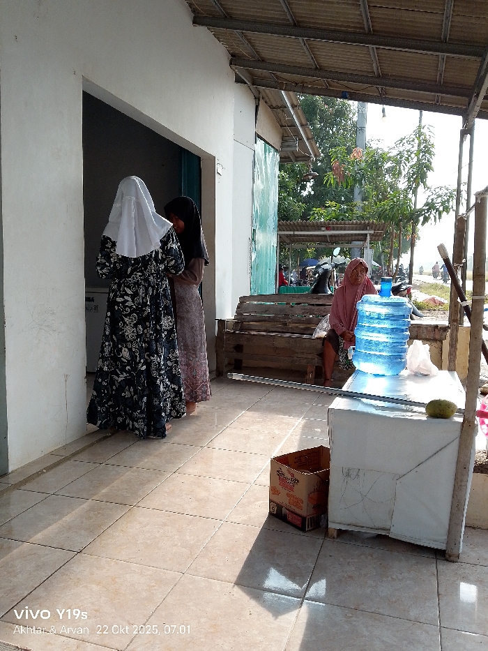 The image depicts an outdoor or semi-enclosed area in Wanguk, Indonesia, under a corrugated metal roof