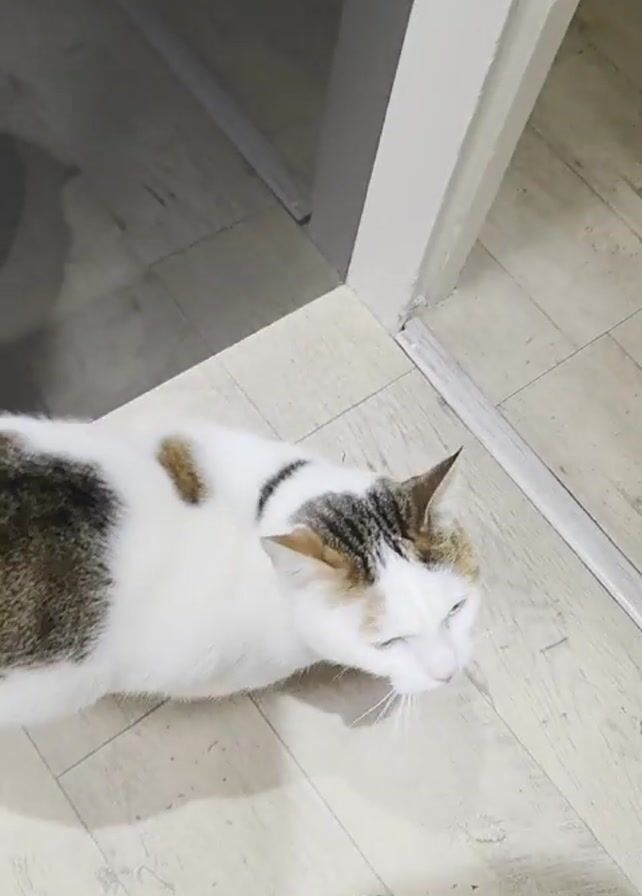 - "A medium-angle shot of a white, brown, and black cat sitting on a light-colored, wood-look floor" by FM-PPRef1, licensed under CC BY 4.0