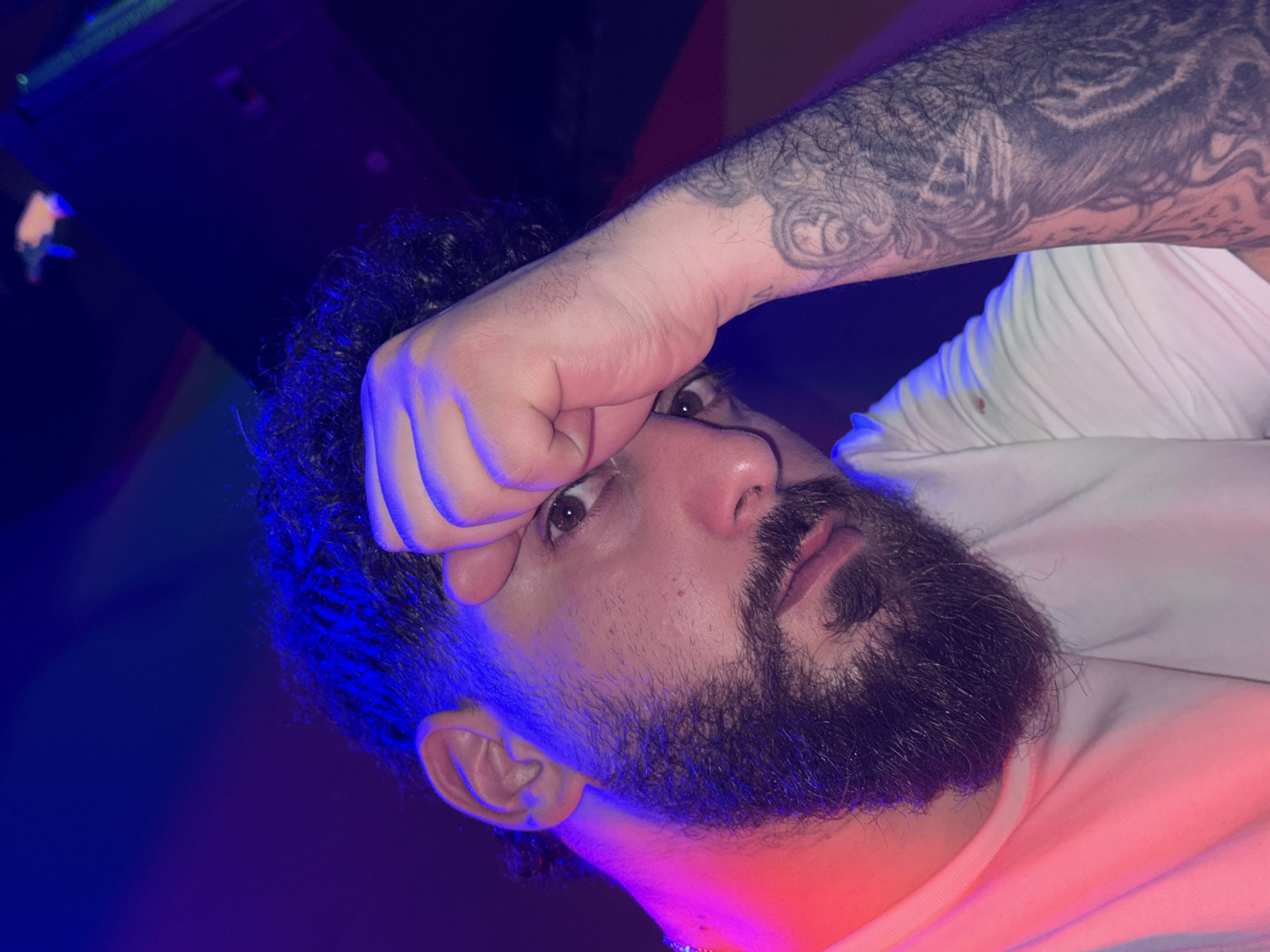 A man with curly hair, a dark beard, and a tattooed arm is holding his forehead