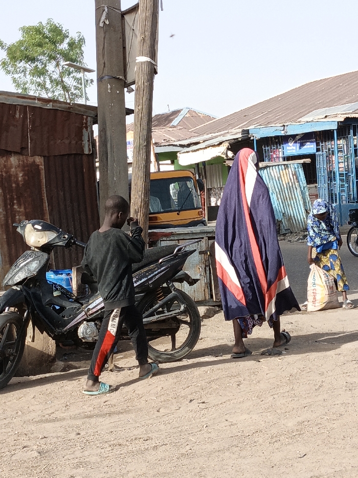 An outdoor, eye-level photograph captured in Gwagwarwa, Nigeria, depicts a dusty, unpaved street scene under a clear, bright sky. In the foreground, a young male, seen from the back, stands facing slightly right, near a parked, dark-colored motorcycle. He wears a dark long-sleeved shirt and dark trousers with a red and white stripe featuring "HMSHMC" text on the right leg, and light blue sandals. The motorcycle, showing wear, is on a kickstand, with a blue object visible on its seat. To the right of the male, an individual walks away from the viewer, heavily draped in a dark blue garment with prominent red and white vertical stripes. They wear dark slippers. Further to the right, a third person, likely female, with a patterned head covering and skirt, is partially visible. She is bent forward, holding a large, light-colored sack with red markings that rests on the ground. In the mid-ground, a concrete utility pole and a wooden pole are bound together with white wraps. A small, square solar panel is attached to the concrete pole. Behind these, a partially obscured yellow three-wheeled vehicle is visible. Structures made of corrugated metal sheets, some rusted brown, form the left background. The right background features several single-story buildings with corrugated metal roofs, some with blue facades, suggesting small shops or residences. A green-leafed tree is visible in the upper left background. The ground is light brown dirt with visible tire tracks.