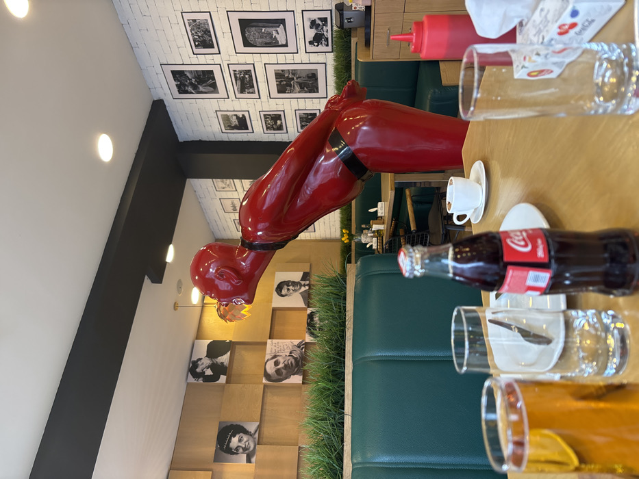 This image depicts the interior of a restaurant or cafe located in Kapan, Armenia. The scene is observed from a diner's perspective, looking towards the back of the establishment. In the immediate foreground, a light-colored wooden tabletop features several items: a glass filled with an amber liquid (likely beer), an empty clear drinking glass, a white ceramic plate with a silver-colored knife resting diagonally on it, a glass bottle of Coca-Cola with its cap on, and another empty clear drinking glass. To the far right, a white tissue box with a Coca-Cola logo is visible. Further back on the table, a white teacup with a handle rests on a white saucer, containing a beverage topped with foam art. Adjacent to it on the right, a red squeeze bottle, likely containing condiments, stands upright. The midground is dominated by a large, glossy red humanoid statue, positioned to the right of the central axis, bent forward at the waist with its head tilted upward and to the left. Its mouth is open, emitting a spiky, yellow-orange, flame-like or explosive form. The statue wears a black band around its neck and another black band around its lower back/hips, resembling a belt. Its hands appear to be positioned behind its back. Behind the statue and the foreground table, a section of green upholstered booth seating is visible, bordered by a low planter box filled with artificial green grass. Beyond this seating, additional wooden tables with black wire chairs are present, one featuring a small vase of yellow flowers. The background consists of two distinct wall sections. The left wall features light-colored wooden paneling adorned with several framed black and white portraits of individuals, including a smiling woman, a man with his hand on his head, Charles Aznavour with a visible signature, and another man in a suit. The right wall is constructed of white brick-patterned material, covered with numerous framed black and white photographs of various sizes, arranged in a dense, irregular grid. The ceiling is white with several recessed circular light fixtures, and a prominent black structural beam runs horizontally across the upper portion of the image.