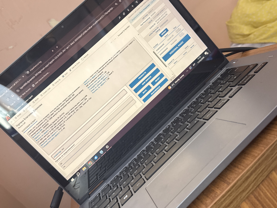 A silver-colored laptop is positioned at an angle on a light brown wooden surface. The laptop's screen displays an active customer relationship management (CRM) interface, identified as a Microsoft Dynamics 365 "Phone Call" application, with text predominantly in Bulgarian. Key details on the screen include a "CUSTOMER SCRIPT" section, a customer name "ГЕРГАНА БЛАГОЕВА ДОЙКОВА," and interactive buttons such as "ПРОДУКТИ" (Products), "НАЗАД" (Back), "НОВИ УСЛУГИ" (New Services), "НУЛИРАНЕ" (Reset), and "ПРЕНАСРОЧВАНЕ" (Reschedule). The interface also presents call details, including an agent registered as "Borka Gospodinova," a "Call Time: 00:00:09," a "Call ID," and a Bulgarian phone number "359899006049." Browser tabs visible in the background show URLs, specifically "atpartners.a1.bg," indicating an association with A1 Bulgaria, a telecommunications provider. This context places the operational scene within an office or remote work setup in Sofia, Bulgaria. The Windows taskbar at the bottom of the screen displays the date 13/03/2006, time 11:15 AM, and weather information showing "5°C Mostly sunny." A black cable is connected to the left side of the laptop. The background consists of a plain, light peach-colored wall, with a yellow piece of fabric or garment partially visible and out of focus to the right. No individuals are visible in the scene.