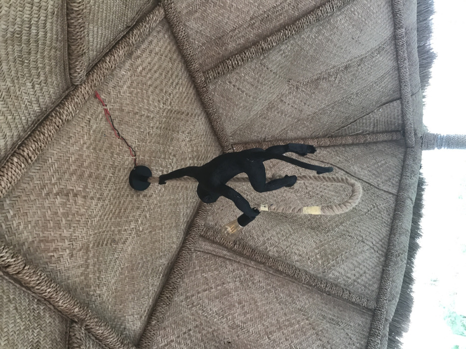 The image depicts the interior of a thatched roof structure located in Bwari, Nigeria. A black, stylized monkey figure is suspended from the center of a conical or pyramidal ceiling, which is constructed from tightly woven straw or thatch in a herringbone pattern. The monkey's right hand grasps a clear, vintage-style light bulb, while its left hand holds a thick, light-brown rope that hangs downwards in a loop. The monkey is attached to the ceiling via a circular black mounting plate, from which exposed red and black electrical wires extend along the woven surface. Visible structural ribs of the ceiling are also covered in the same woven material. The lower edge of the roof features a fringed thatch finish, with a bright, out-of-focus background suggesting an outdoor environment beyond. No individuals are present in the scene.