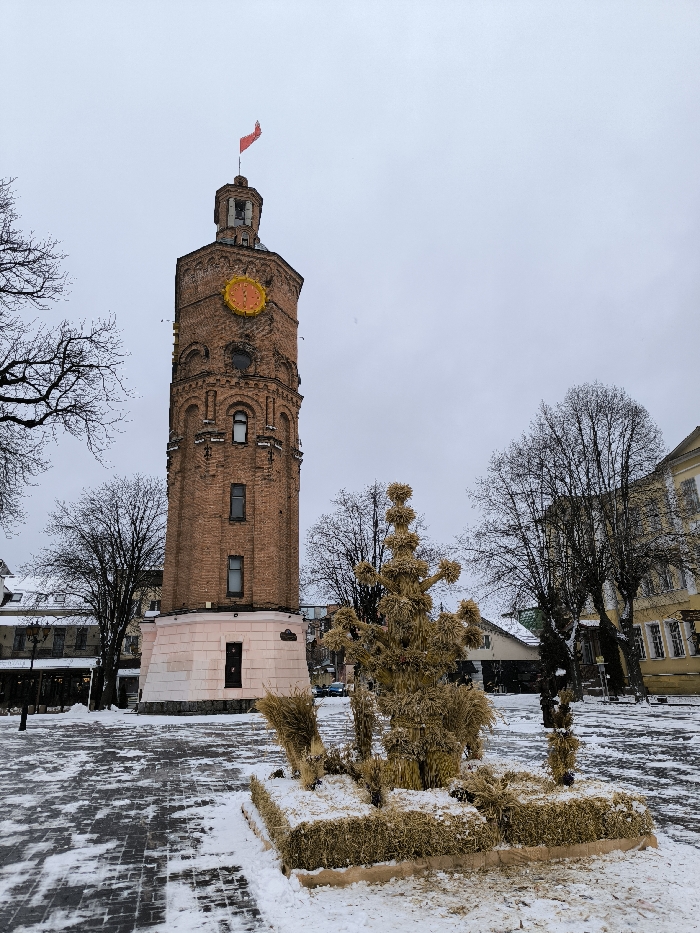 - "The image displays a winter street scene in Vinnytsia, Ukraine, dominated by the Vinnytsia Water Tower under an overcast grey sky" by FM-dWhzM2, licensed under CC BY 4.0