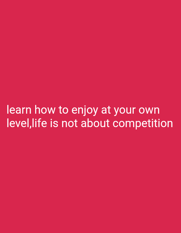 The image displays a solid, uniform crimson-red background. Against this background, white, sans-serif text is centered horizontally and positioned in the lower half of the frame. The text reads: "learn how to enjoy at your own level,life is not about competition". The first line ends with a comma, and the second line begins without capitalization for "life." No people, discernible objects, or specific actions are depicted. The environment is a featureless, flat red field. The image provides no visual information to indicate a location in the city of Gandu Albasa, Nigeria, or any other specific geographical setting.