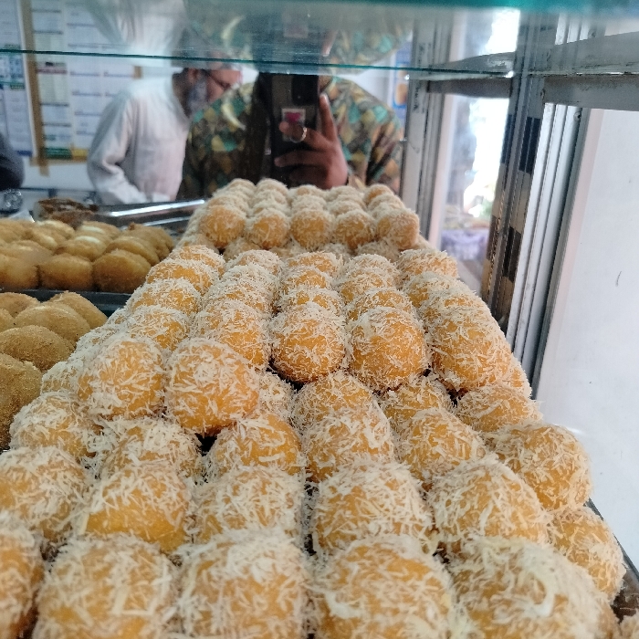 display case filled with a large number of sweet pastries coated in shredded coconut. The pastries are stacked in rows in a glass display case. Two individuals are visible in the reflection, one wearing a white shirt and the other wearing a green and black shirt. The individual in the green shirt is holding a cell phone to take a photograph of the pastries. The location is a shop in Bhola, Bangladesh, at coordinates 22.686 latitude and 90.645 longitude. The pastries appear to be a popular local delicacy. The background is blurry, but it seems to be a commercial space.