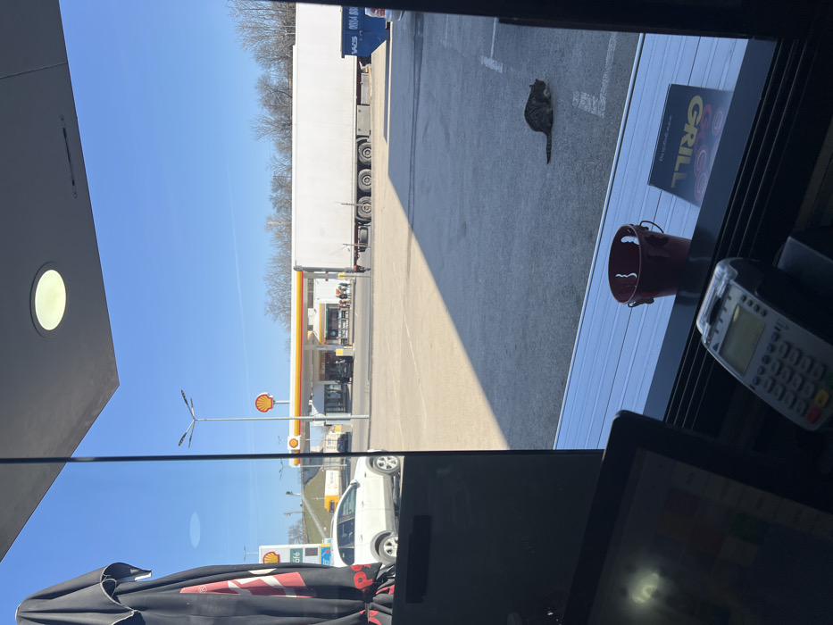 The image captures an exterior scene on a bright, sunny day, viewed from inside a commercial establishment through a large glass window. The foreground shows elements of the interior, including a dark folded umbrella on the far left, reflecting a partial red and white logo. On the windowsill, a small, red decorative metal bucket is visible, along with a dark booklet titled "GRILL" (with "www.gogrill.bg" also printed) lying flat. A white payment terminal with a small screen and keypad rests on a dark counter in the lower-left, next to a partially visible monitor screen. The midground is dominated by a large asphalt parking lot, marked with white lines, under a clear blue sky. A significant diagonal shadow extends across the parking lot from the left. A brown and grey tabby cat is crouched on the asphalt in a sunlit area, facing right. To the right, a long, white semi-trailer truck is parked, its trailer stretching horizontally across the frame. Behind the truck, a blue industrial waste container (dumpster) with "WACS 0084 800" in white lettering is visible. In the mid-left, a tall, grey streetlamp with three lights stands. A white SUV is parked or moving in the left-midground. The background features a Shell gas station complex. It includes a prominent yellow canopy covering fuel pumps, and the distinctive red and yellow Shell scallop logo is displayed on a tall pole sign to the left and on the station building's canopy. Several individuals are visible near the pumps and the station building, some appearing to be standing or queuing. Further in the background, a road or overpass structure is visible on the far left, behind the Shell pole sign, with a yellow truck present. Bare trees line the horizon, and the sky is a clear, cloudless blue. The scene is located at a Shell gas station on a main thoroughfare in Ruse, Bulgaria, likely viewed from an adjacent "GoGrill" restaurant, as indicated by the menu on the windowsill. A specific potential location is along bul. "Treti Mart" in Ruse, known for its commercial and truck-friendly facilities.