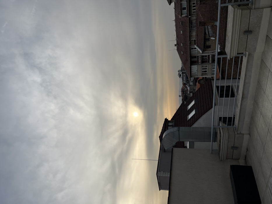 An elevated, wide-angle photograph captures a dense urban landscape in Sofia, Bulgaria, under an overcast sky. The sun is visible as a diffused, bright circular light source in the upper-middle left portion of the frame, creating a localized yellowish glow amidst the otherwise grey cloud cover. In the immediate foreground, a light-colored tiled terrace is visible, bordered by a grey metal railing composed of horizontal bars and vertical posts, supported by light-colored concrete pillars. A dark, rectangular object, possibly a planter or outdoor furniture, rests on the terrace in the lower-left corner. To the left, a light-colored building facade rises, topped with a flat roof from which a slender, vertical antenna-like rod extends upward. Directly behind the railing and to the left, a building with a dark brown pitched tile roof is visible, featuring two distinct rectangular skylights. A large, curving grey metallic ventilation duct extends from this building's roof upwards and to the left. Further into the mid-ground, numerous multi-story residential or commercial buildings with varied architecture and predominantly terracotta-colored tiled roofs are arrayed across the scene. Some roofs display small dormer windows or additional skylights. The background shows a distant, hazy skyline of additional urban structures, blending into the atmospheric conditions. The scene is devoid of discernible people, actions, or interactions.