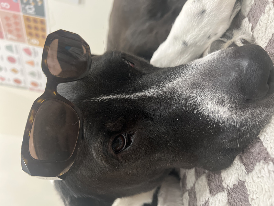 A domestic dog, primarily black with white markings on its snout, chest, and a foreleg, is depicted in a close-up, medium-angle indoor shot, located in the City of Newburgh, United States of America. The dog is lying down on a light-colored, possibly off-white, textured textile surface with a waffle-like pattern. A pair of brown tortoiseshell-patterned sunglasses with dark, rectangular lenses is positioned on the dog's forehead. The dog's dark brown eyes are partially visible beneath the sunglasses, appearing open and directed slightly forward. A white foreleg with dark speckles is visible to the right. The background is a blurred light-colored wall, featuring an out-of-focus chart or poster with multicolored squares and numbers, including a partially legible '10'.