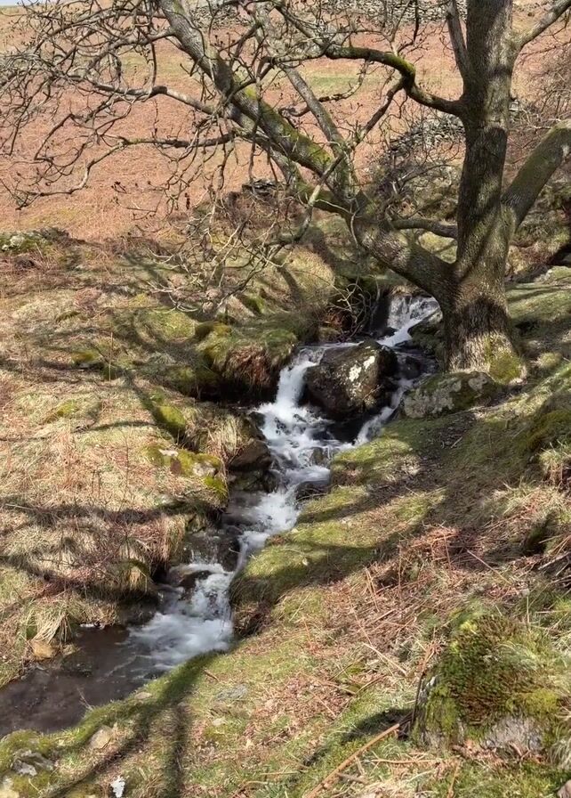 small stream flowing downhill in a wooded area. A large tree with bare branches stands next to the stream, casting shadows on the ground. The ground is covered in grass, moss, and fallen leaves. The stream flows over rocks and creates small waterfalls. The sky is partly cloudy.
