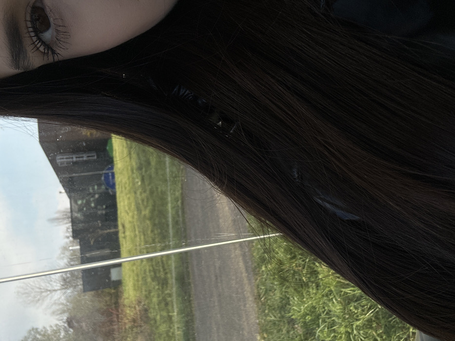 The image displays a partial view of a female subject, situated in Entzheim, France, under daylight conditions. The right half of the frame focuses on the subject's right eye, which is brown with mascara-enhanced eyelashes, and a portion of her nose. A substantial volume of straight, dark brown hair cascades over her right shoulder and chest. Beneath the hair, a dark-colored garment, consistent with a jacket, is partially visible. The left half of the frame presents a background scene viewed through a transparent surface, likely a window. This background depicts a vibrant green grassy area in the foreground, transitioning to a grey asphalt road or pathway running horizontally across the midground. In the distance, a large, dark-colored building with multiple vertical window structures is visible on a slightly elevated grassy bank. Closer to this building, a blue object and a green object are present on the grass. The distant landscape includes several deciduous trees, some appearing bare, beneath a partially cloudy sky with visible blue patches. A thin, vertical, light-colored linear element, consistent with a window frame, extends vertically through the scene on the far left.