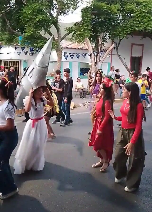 A parade is taking place, with people dressed in various costumes and performing a dance